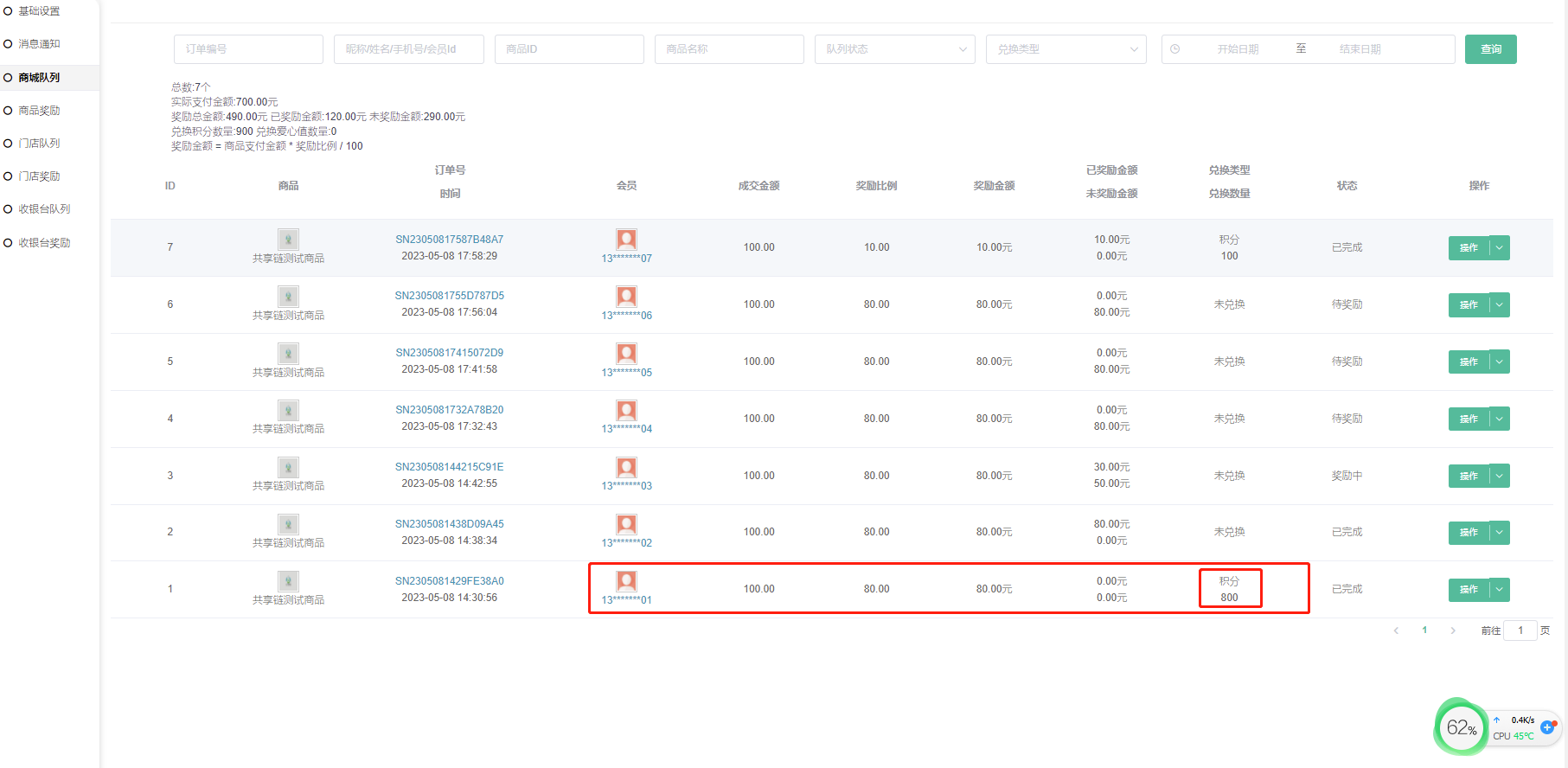 (2)商品队列:每一个商品订单单独作为一条线;即每一个商品的订单单独排队,只有购买该商品才会提取订单百分比奖励给该商品排队中的权益,该模式如果商品下架了则后续永远不会再奖励。